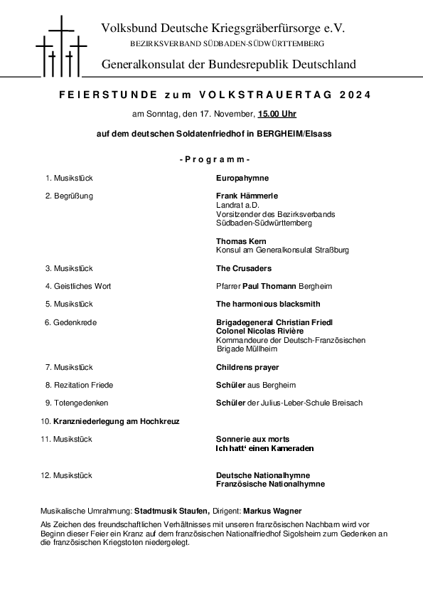 Die Gedenkfeier zum Volkstrauertag 2024 wird am Sonntag, den 17. November um 15.00 Uhr auf dem deutschen Soldatenfriedhof in Bergheim/Elsass abgehalten. An diesem Tag gedenken wir der gefallenen Soldaten und der Opfer von Krieg und Gewalt.